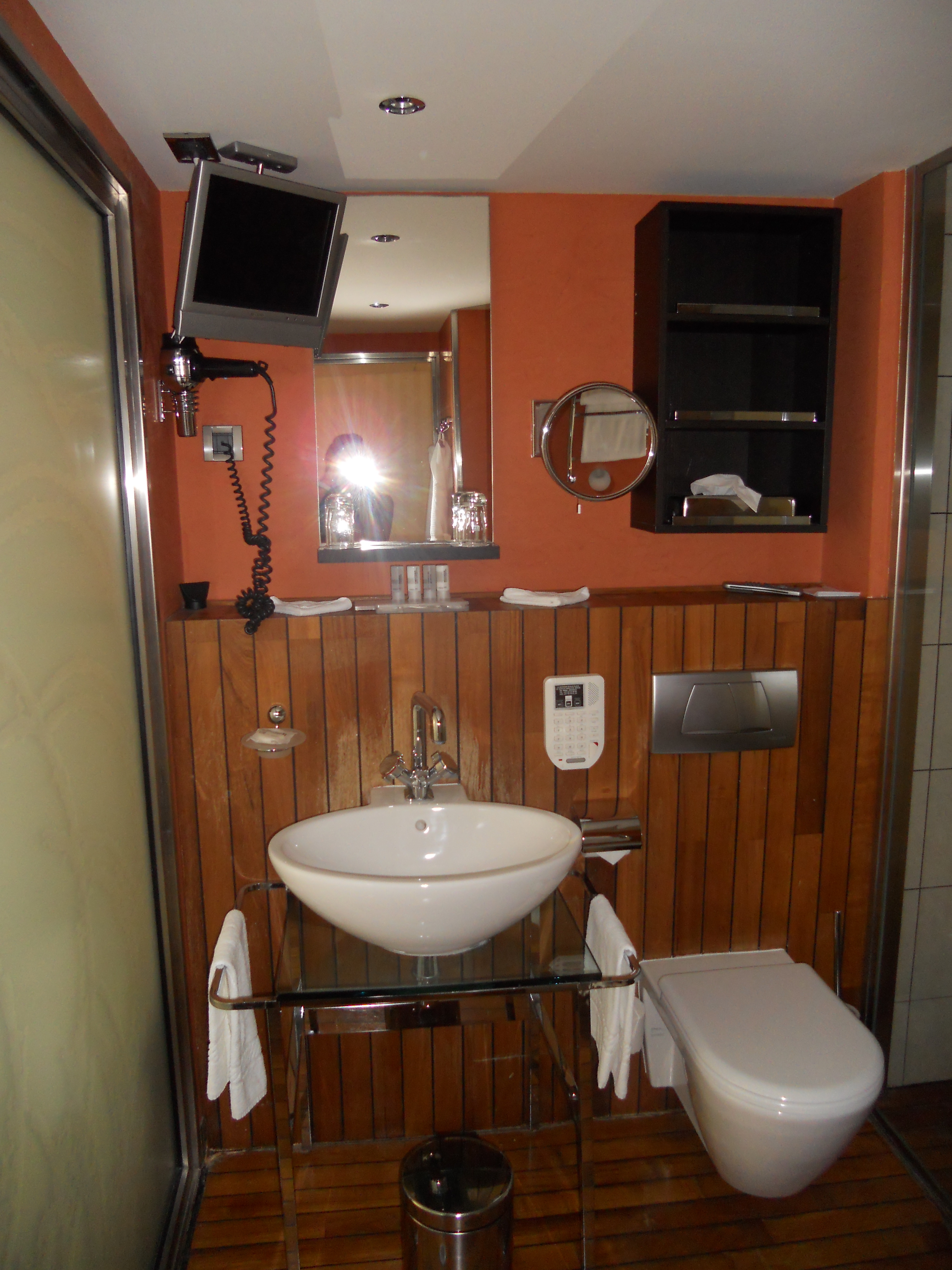 The last positive aspect of the room was clearly the bathroom. I have to admit that I didn’t like the presentation of it (color etc.), but it had a television in it. How cool is that? Perhaps I’m the only person who is so television addicted, but I would love to have a television in my bathroom. But this wasn’t the only favorite in the bathroom, I really liked the shower. It was so huge and with two shower heads. I really don’t have a negative point in regard of the room.