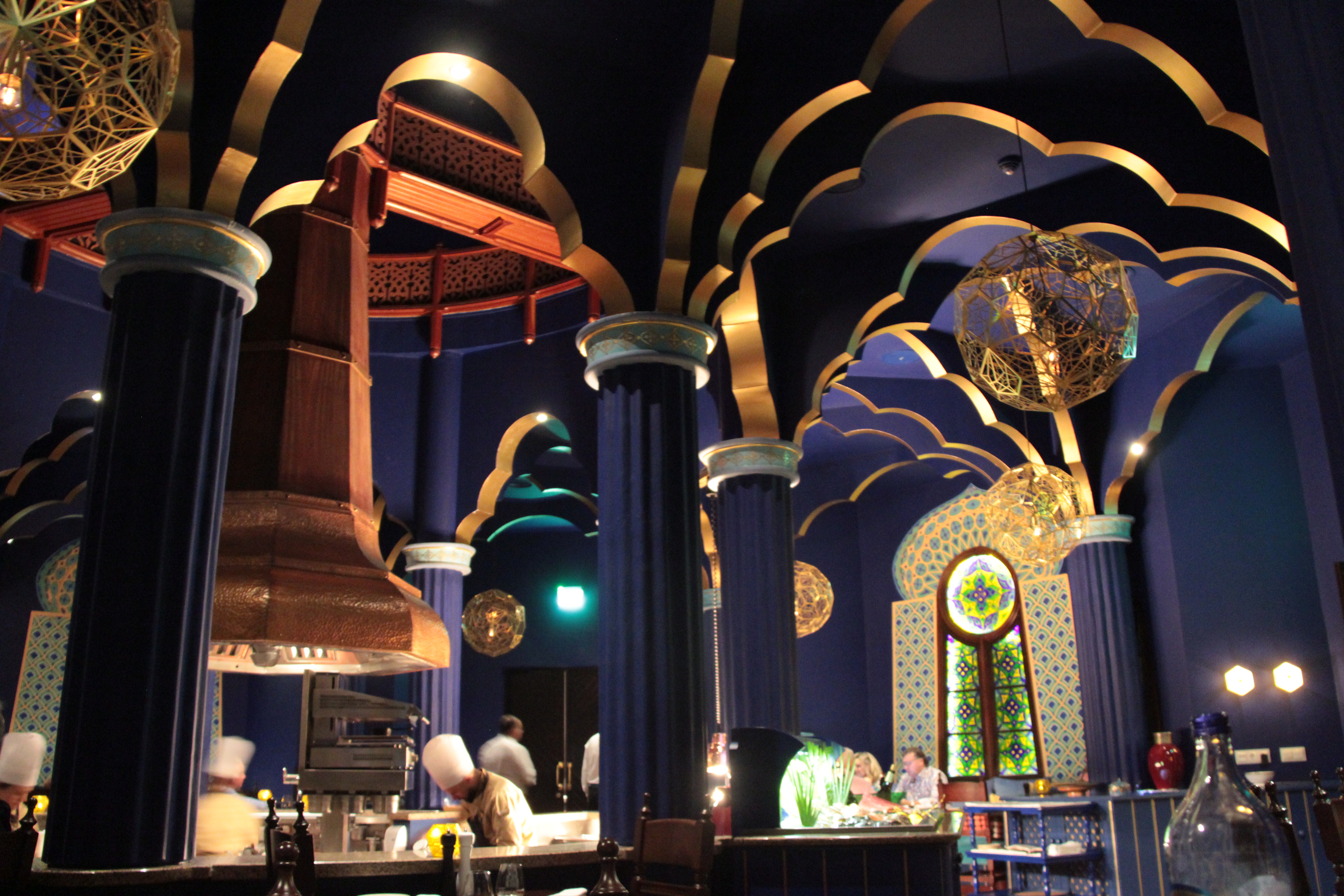 The Aladin Grill Restaurant is a sort of live cooking restaurant where the kitchen is located in the middle of the room. The whole atmosphere remembers a Moroccan-inspired restaurant.